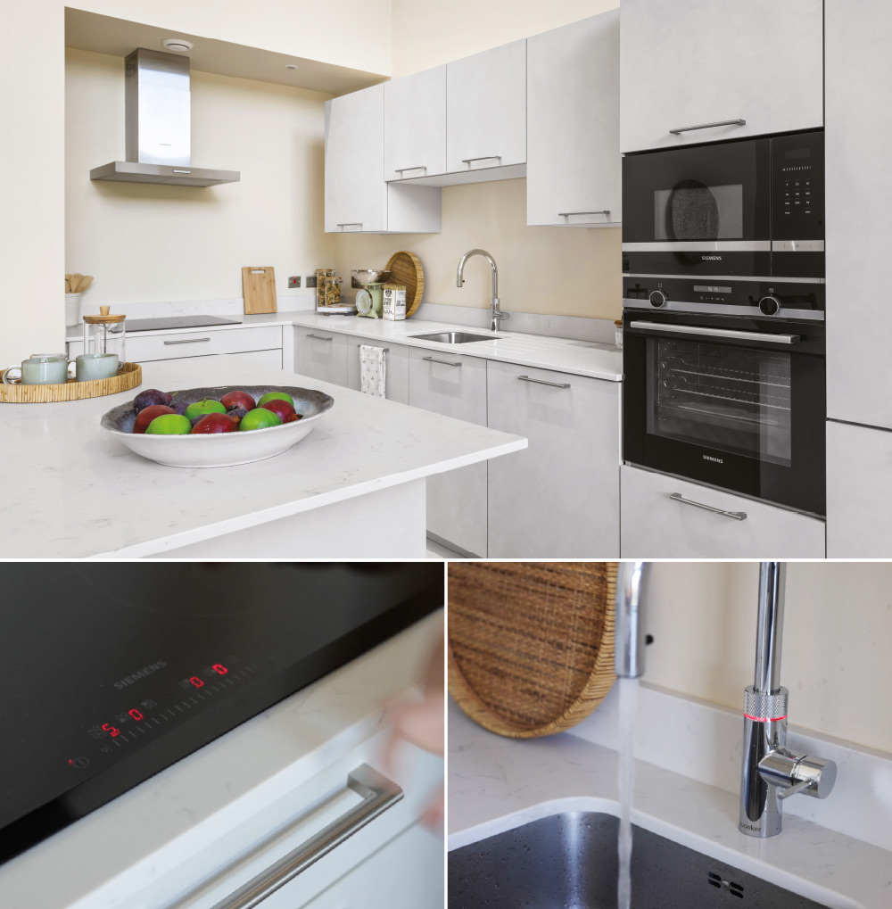 The use of high-quality, durable materials such as granite countertops, Porcelanosa tiles and energy-efficient Siemens appliances – including a main oven, fridge freezer and dishwasher – reflects a commitment to sustainability and longevity. Apartments also feature Quooker taps for instant boiling water and safe, precision heat control granted by an induction hob.